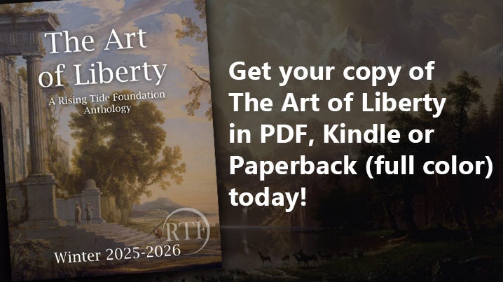 Today, Cynthia and I are announcing the first ever Rising Tide Foundation seasonal Anthology which we titled ‘The Art of Liberty’ available as PDF on Gumroad, or Paperback on Amazon, and Kindle. (We apologize for the high cost of the physical edition which is only so expensive due to our choice to have the highest definition full color images available)