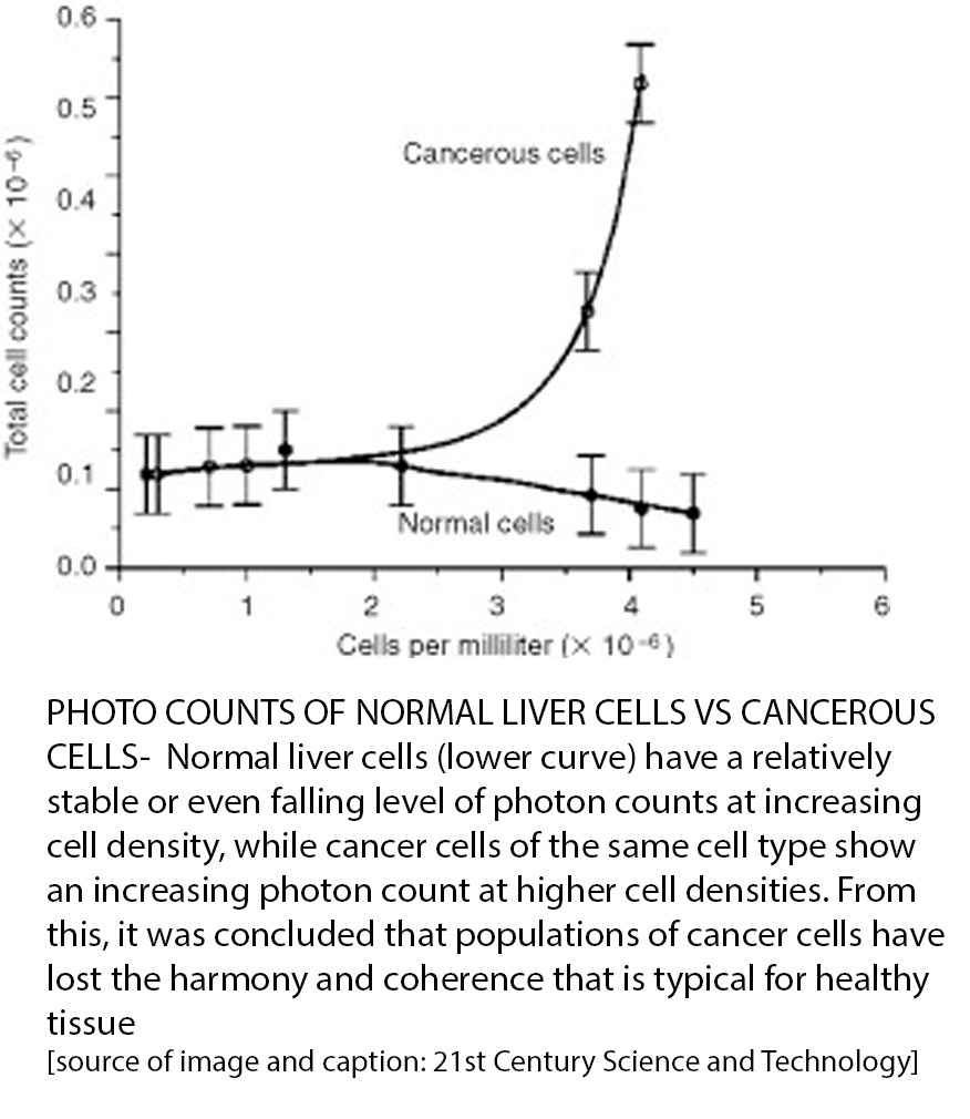 After discovering the work of Gurwitsch, Dr. Popp began measuring the ultra-weak light emissions from the Benzpyrene molecules and their effects upon cell growth in liver tissues and found that the extremely high light absorption/emission properties of Benzpyrene 3,4 were the cause of the disharmony of cell regulation. Measuring the photon activity from cancerous vs healthy liver cell growth is a striking way to clearly see that cancerous growth coincides with exponential photon emissions while healthy liver photon emissions are very stable.