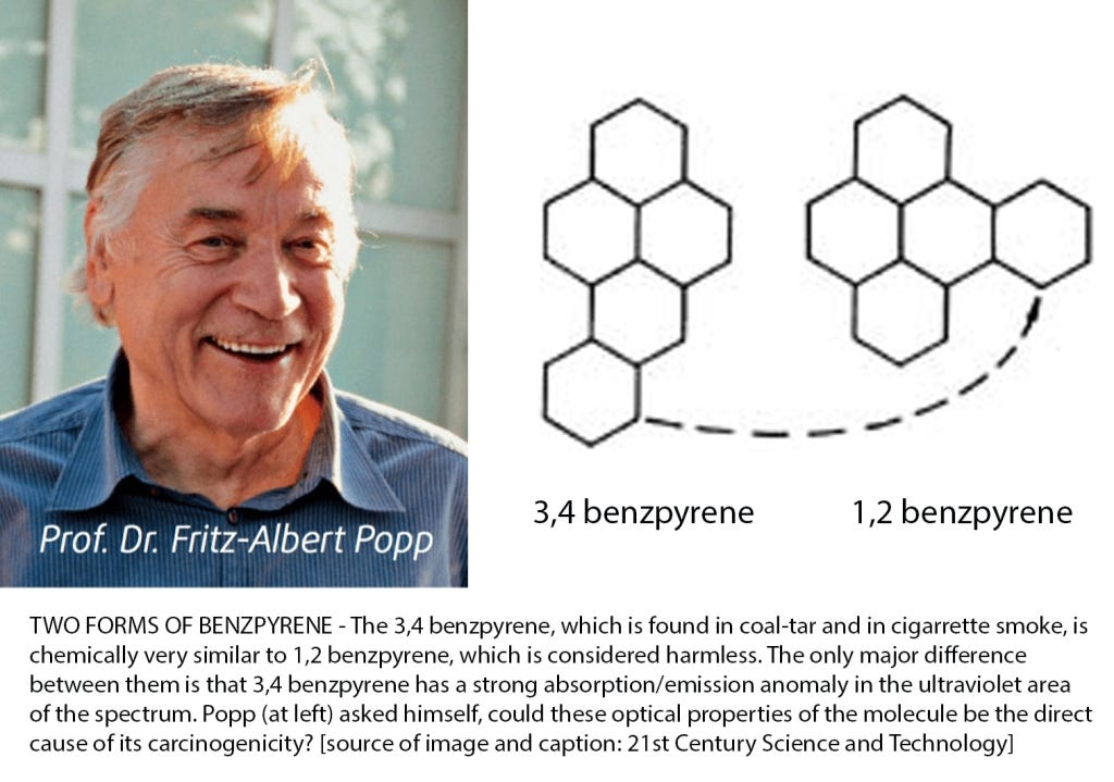 During the 1970s, Popp was a cancer researcher trying to figure out why only one of the two isomers of Benzpyrene caused cancer. An isomer is sometimes known as a mirror image configuration of a molecule which are chemically identical, yet whose properties can differ vastly. Under the materialist/reductionist’s logic, there was no reason why one isomer (Benzpyrene 3,4) which is found in cigarettes and tar would induce cancer growth in lung tissue while another isomer (Benzpyrene 1,2) would be completely benign.