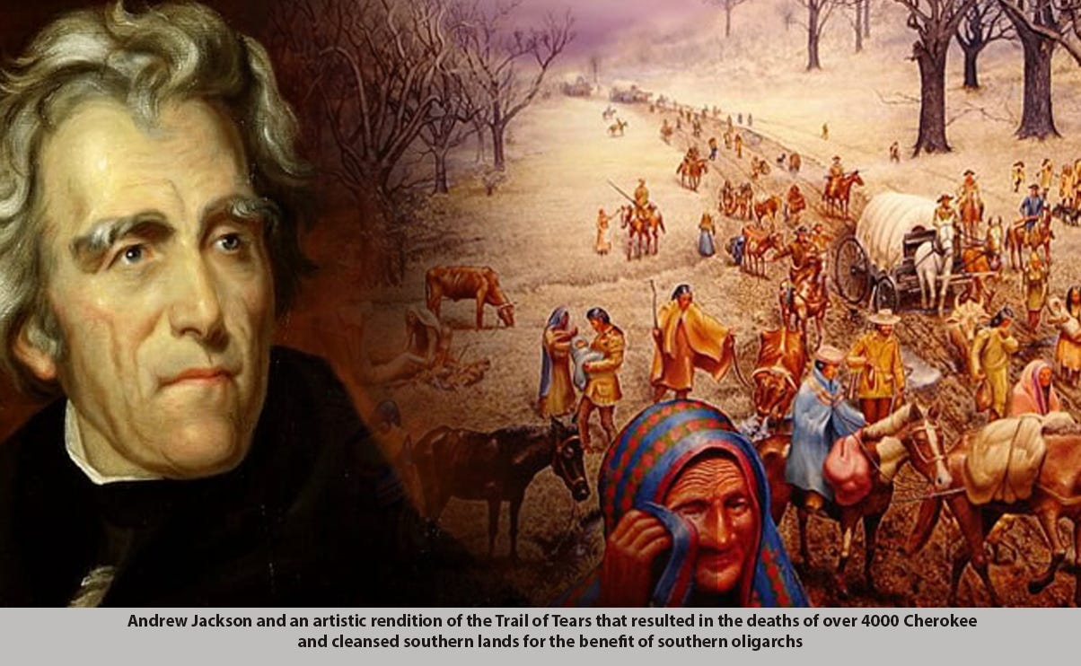 In America, the clash between American vs British Systems defined all major conflicts from 1836 when a racist tool named Andrew Jackson killed the 2nd National Bank (along with thousands of Cherokee) and brought the nation under the heal of British Free Trade, speculation, and cotton plantation economics. Following the IMF’s protocols that would be imposed onto victim nations 150 years later, Jackson cancelled all internal improvements in order to “pay the debt” and deregulated the banking system which resulted in the growth of over 7000 separate currencies issued by an array of state banks rendering the economy chaotic, bankrupt and prone to mass counterfeiting.