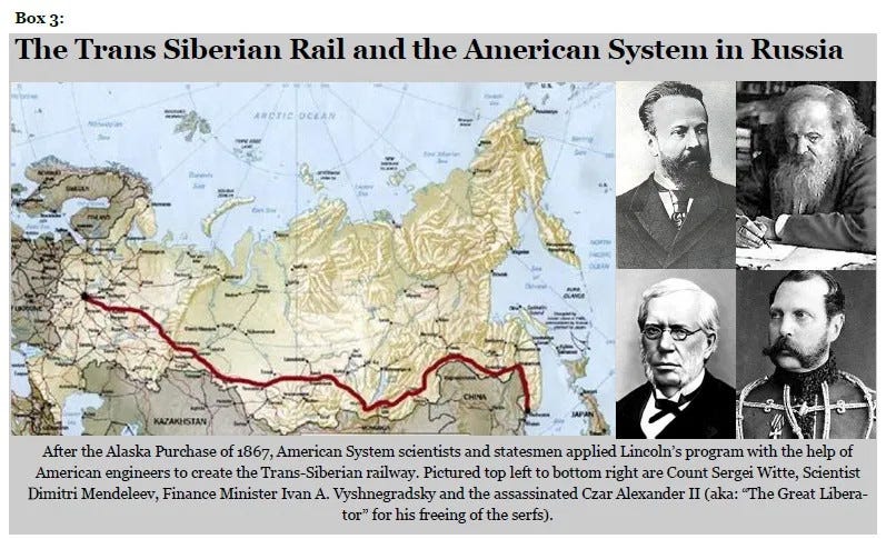 While this effort failed with Lafayette’s supplication to the scheme of re-instating a French King in 1830 rather than declare himself the President (as I outlined in my recent paper on the Congress of Vienna), List studied Hamilton’s system and was the first to codify it as the American System of Political Economy (1827). This was the system which List transported to Germany by driving rail development, industrial growth, protectionism under the German Zollverein which finally blossomed under the rule of Chancellor Otto von Bismarck. List’s system was also studied, translated and applied in Russia by many “American System economists” with the greatest being the Transport Minister and Prime Minister Sergei Witte who oversaw the trans Siberian railway’s completion and envisioned a line eventually connecting the Americas to Russia via the Bering Straits.