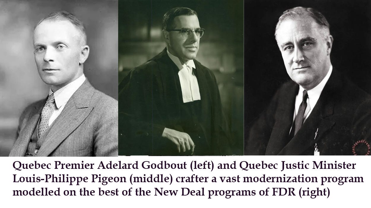 Prior to Maurice Duplessis, Québec’s break with cultural backwardness that had plagued its population for so long, had been initiated most boldly with Premier Adélard Godbout (1939-1944) and his creation of Hydro Quebec via the nationalization of Montreal Light, Heat and Power Company. Godbout’s collaborator Louis Philippe Pigeon was inspired by Roosevelt’s Tennessee Valley Authority, and began bold programs that unleashed cheap electricity, advanced agricultural technologies and rural electrification, breaking the usurious private stranglehold of Montreal Light, Heat and Power which had been prohibiting development and squeezing the population dry with expensive and unreliable electricity for decades.