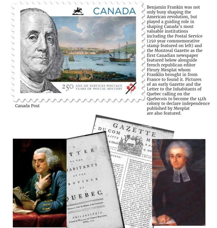Today, Canadians (and Americans) find themselves shocked when confronted with the fact that Canada’s first postal service and first newspaper were both created by … Benjamin Franklin!