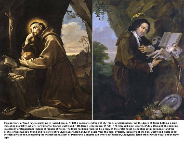 The satirical painter William Hogarth astutely captured this irony in his biting rendition of Sir Francis Dashwood dressed as St Francis of Assisi, except featuring an erotic novel instead of a bible, a naked woman instead of Jesus, a Venetian masque, and the figure of fellow Hellfire leader Lord Sandwich as a lunar god instead of a hallow, indicating the Dionysian orgiastic ceremonies performed at night by the initiated.