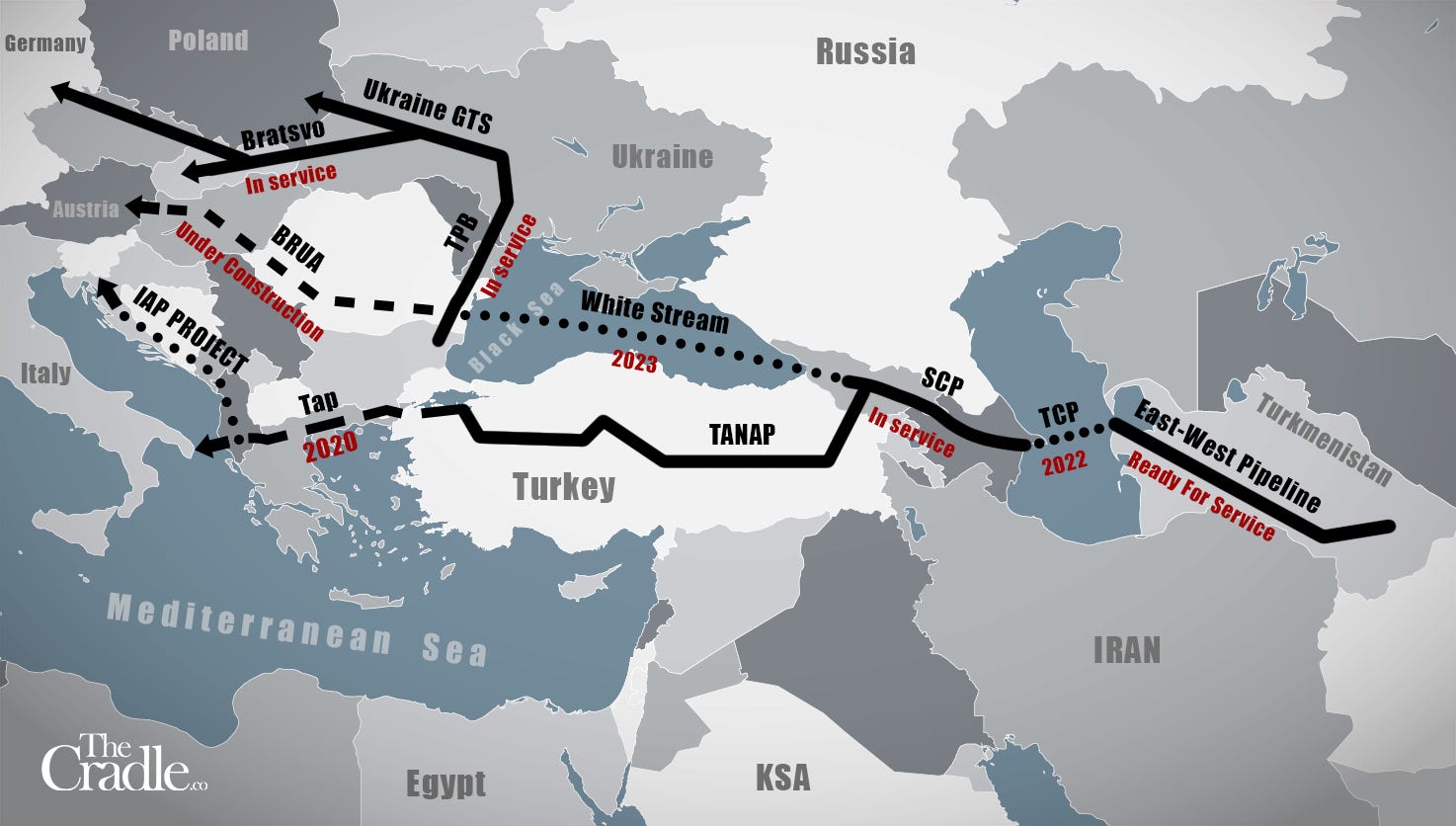 The final branch to Europe via the Nabucco gas pipeline will easily be completed (if political sabotage is avoided), providing Europe with abundant gas for generations. This will give both Iran and Russia a position of vast economic leverage with a mismanaged Europe now experiencing one of the worst man-made energy crises in history.