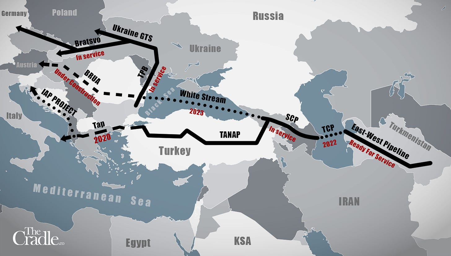 As Pepe Escobar has observed in his recent contribution to The Cradle, the Chalous Gas fields in the Caspian not only represent the tenth largest reserves in the world with a $5.4 trillion value but, according to experts, this region alone could service 52 percent of Europe’s natural gas needs for 20 years. As of this writing, agreements have been signed, which will see this region developed by Russian, Chinese and Iranian interests.