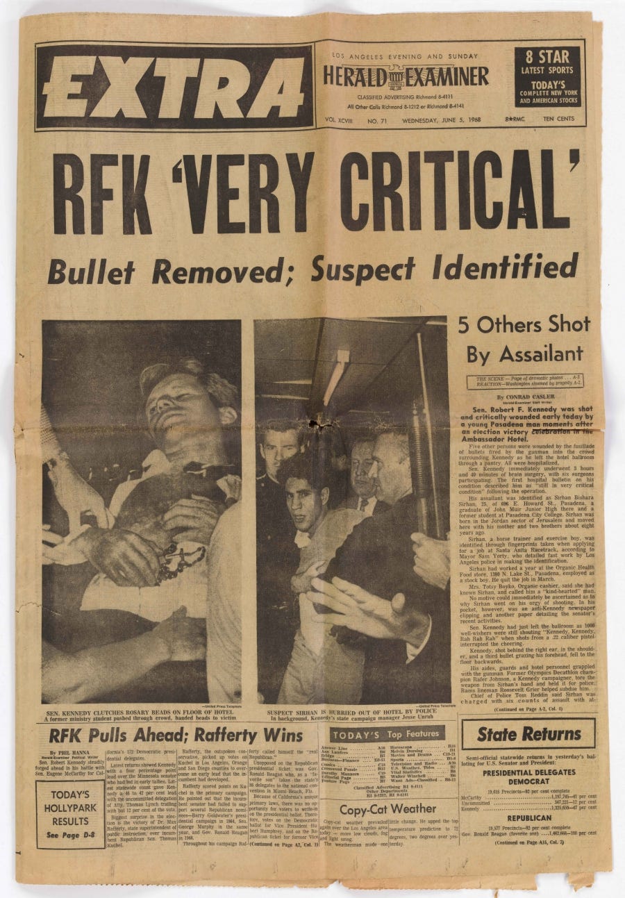 Indeed, just one day after his victory of the democratic primaries in California on June 4, 1968, Bobby Kennedy was shot and killed at the Ambassador hotel in Los Angeles.
