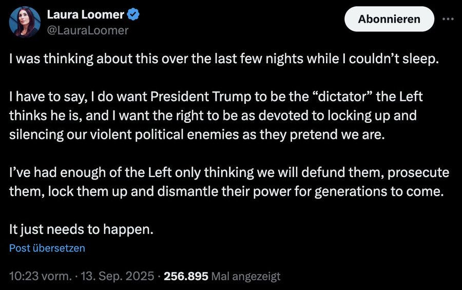 On September 13, Conservative Influencer Lara Loomer wrote on X: “I do want President Trump to be the ‘dictator’ the Left thinks he is, and I want the right to be as devoted to locking up and silencing our violent political enemies as they say we are.”