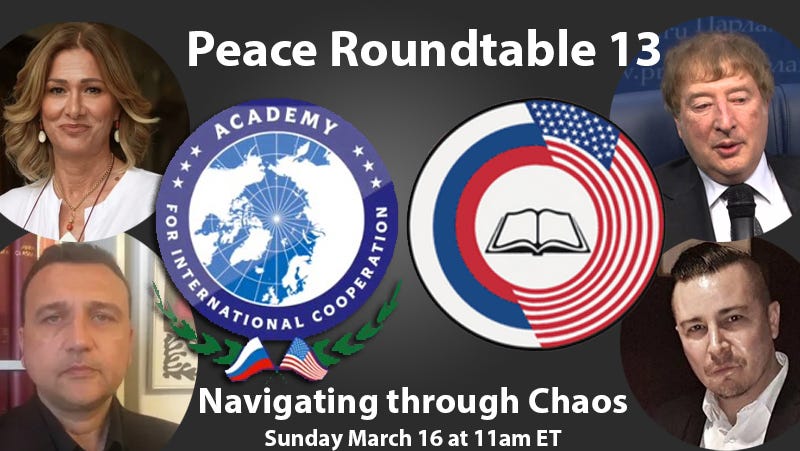 This Sunday March 16 at 11am ET, I will be hosting the 13th Peace Roundtable (sponsored by the American University in Moscow and Academy for International Cooperation) which will focus on identifying the causes and solutions to today’s chaotic world.