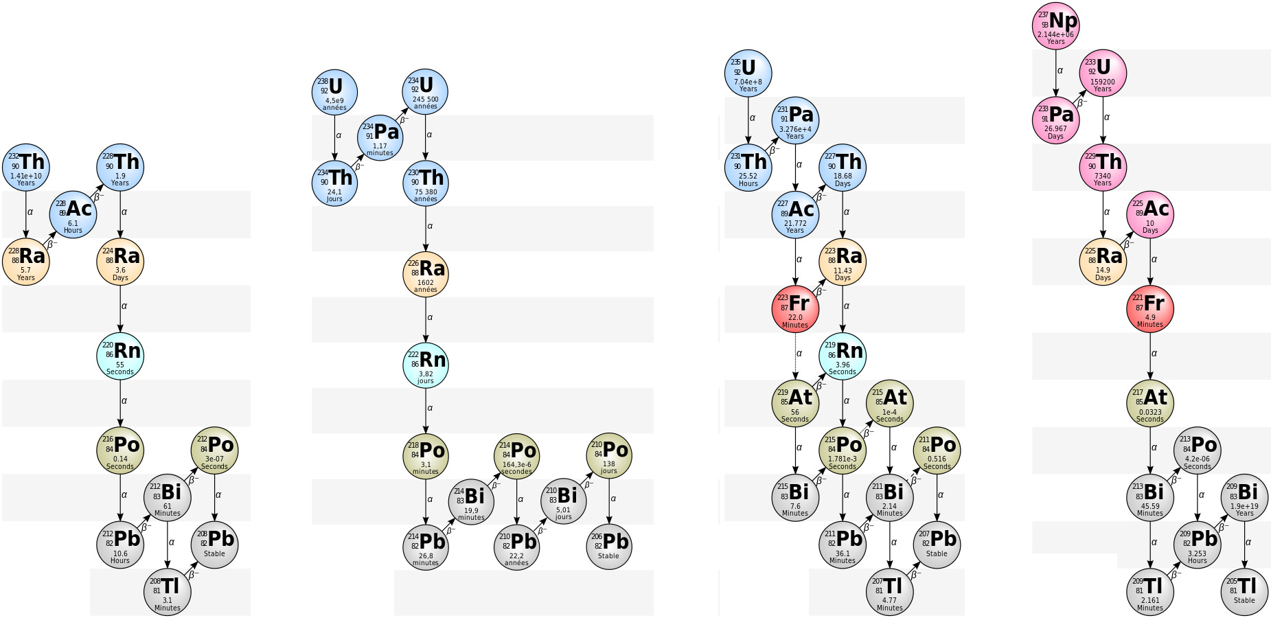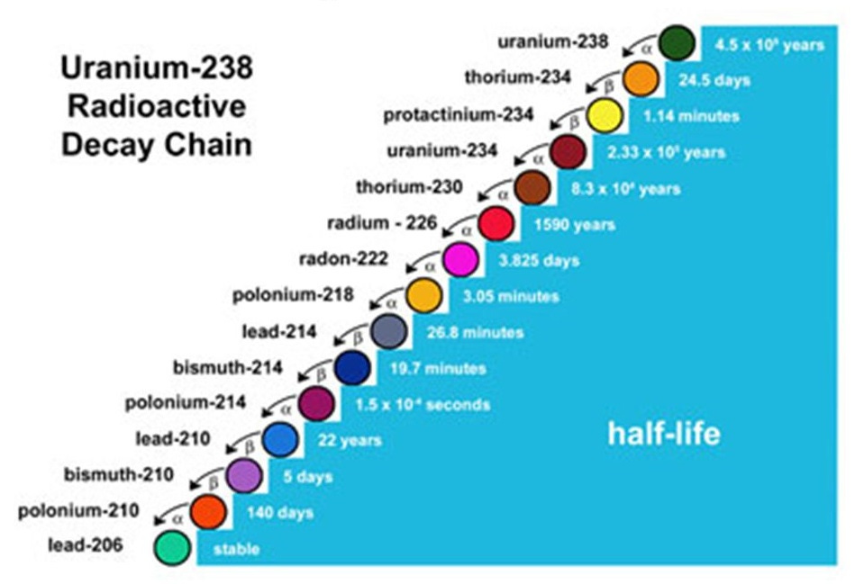 One of the four decay chains (U-238 to Lead-206) is featured below:
