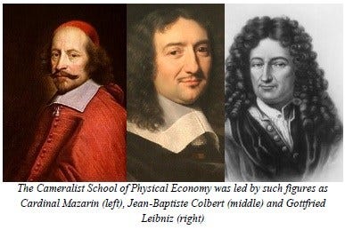 This American System was the effect of rigorous studies of Platonic texts such as the Republic, and the French Cameralist (aka: Dirigist) economic school as applied by such leading organizers of the Westphalian Treaty as Cardinal Mazarin, and France’s Finance Minister Jean-Baptiste Colbert, not to mention their spiritual heir, the great scientist and statesman Gottfried Leibniz. Nearly written out of today’s history books, these men played a direct role in the formation of the early colonies of the Americas and New France. In his 1984So You Wish to Learn All About Economics?, a modern representative of this tradition, Lyndon H. LaRouche (1923-2019), credits Leibniz as also having been the founder of the science of Physical Economy and intellectual inspiration for the American System. Virtually every nationalist American president who attempted to revive this system throughout the coming two centuries, including President Trump most recently, had to contend with Britain’s deep state structures within America itself.