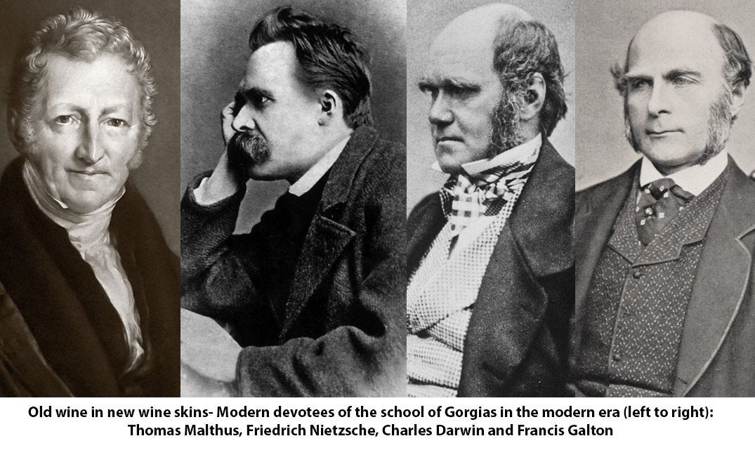 It was Friedrich Nietzsche who taught, following Gorgias’ student Callicles 2000 years earlier, that it is only by courageously severing ourselves from the illusory force of our conscience, that we may tap into the creative energy and strength needed to impose our will onto the weak in a struggle for survival. The new human to emerge out of this struggle of ‘will to power’ over the weak and unfit would become a new breed of elite Uber menschen capable of directing evolution according to scientific principles.