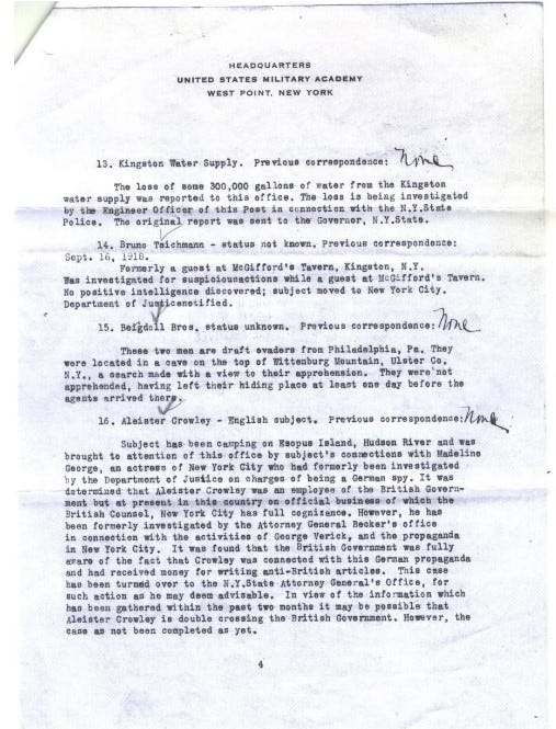 “Aleister Crowley – English subject. Previous correspondence: Subject has been camping on Esopus Island, Hudson River and was brought to attention of this office by subject’s connections with Madeline George, an actress of New York City who had formerly been investigated by the Department of Justice on charges of being a German spy. It was determined that Aleister Crowley was an employee of the British Government, but at present in this country on official business, of which the British Counsel, New York City, has full cognizance.