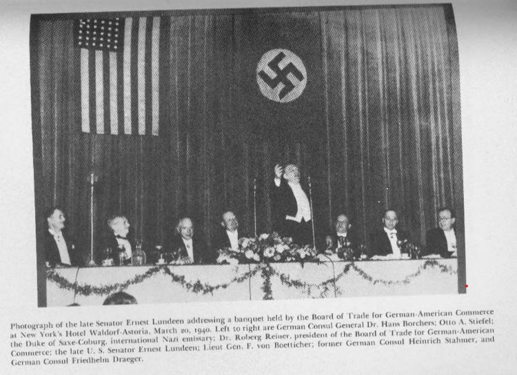Among the Senators and congressmen whom Viereck successfully recruited to the Nazi cause were Congressman Hamilton Fish III of New York, Senator Gerald P. Nye of North Dakota and Senator Ernest Lundeen of Minnesota. In one Madison Square garden Nazi rally organized by Viereck, Hamilton Fish was a featured speaker, and advocated fervently for a pro-Nazi foreign policy with a focus on a German-US special relationship.