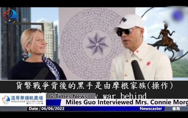 During a June 4, 2022 event celebrating the second anniversary of the Federalist State of New China (and anniversary of the failed Tiananmen Square color revolution), Guo interviewed Ms. Morgan where the heiress explained that the Morgan clan are American heroes for having bailed out the USA in times of financial crisis in 1903 and 1913 which was re-emphasized by Guo who proudly felt that he had set the record strait once and for all.
