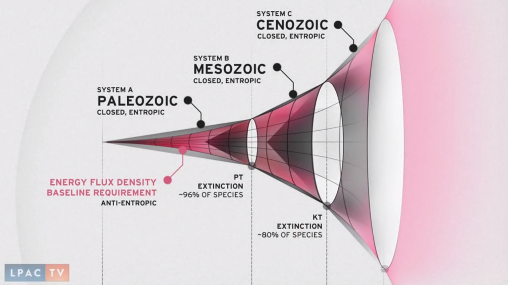 In a later essay titled the Evolution of Species and Living Matter (1928), Vernadsky proves that the biosphere is not only cosmic in nature, but a singular process directed by flow of creative disequilibrium towards ever higher states of anti-entropy and creation… not death, homogenization or decay. Vernadsky writes “the creation resulting from the evolution of new living forms, adapts itself to new forms of existence, augments the ubiquity of life, and enlarges its domain. Life penetrates thus, the regions of the biosphere where it had not earlier had access.”