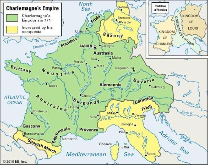 Tying this alliance back to the international geopolitical stage, it is important to recall that Narbonne/Septimania was the key entry point for Silk Road goods to Europe, and its early collapse would have been devastating to the humanist cause. This ecumenical alliance was strong enough to last 90 years before collapsing under the later intrigues of Venice which had managed to get Charlemagne’s small-minded grandchildren to fall into civil war breaking the Carolingian Empire with the 842 Oath of Strasbourginto conflicting regions that later came to become the borders of modern Europe.