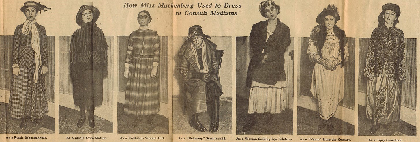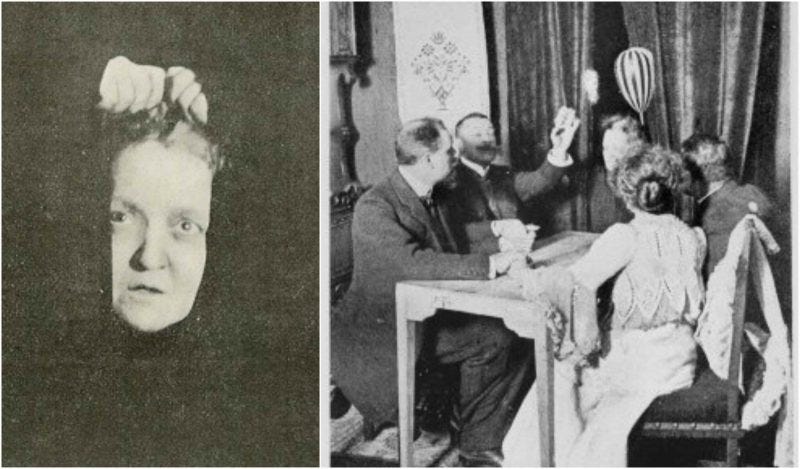 Margery Crandon deployed a number of tricks ranging from exoplasm oosing out of her bodily orifices, to levitation, speaking to the dead and channeling her primary spirit named Walter (her brother who had died years earlier).