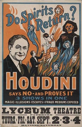 Houdini was renowned for not only debunking fraudsters, but reproducing every single trick including spirit photography, which Houdini mastered in short time, including his own spirit photographs, telepathy, and aparitionism (making objects appear out of thin air- a technique used by Madame Blavatsky and defended by theosophists to this day).