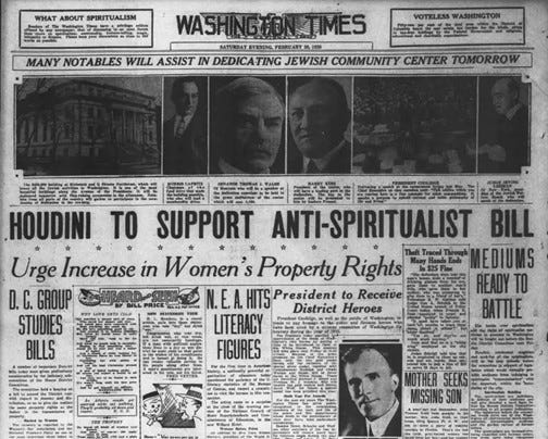 During the congressional hearings on spiritualism, Houdini’s network of informants were frequently asked to testify which resulted in the embarrassing exposure that not only President Coolidge himself (and most of Coolidge’s cabinet) but when it was revealed that even Senator Capper, the man in charge of the Senate version of the anti-spiritualist bill, was a frequent attendee of Washington seances, it was clear that the bill would not be permitted to pass into law.