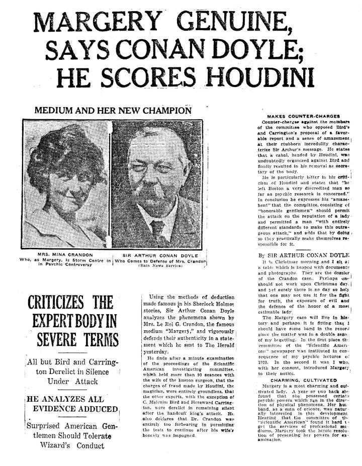 The New York Herald Tribune wrote of Houdini’s role exposing Crandon on February 7, 1925:
