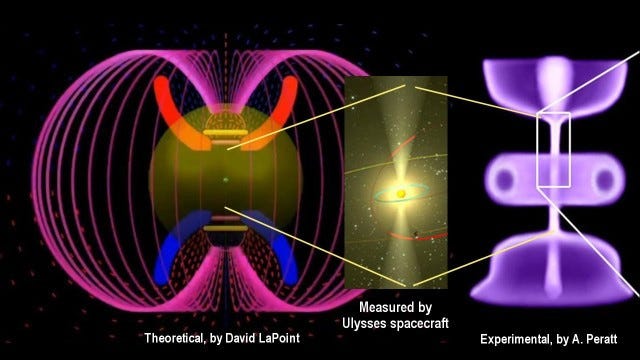 One of the leading figures of the plasma universe school is Anthony Peratt (a leading physicists at the Max Planck Institute for Physics and Astrophysics and close collaborator with Hannes Alfvén), who generated an incredible model of spiral galaxy structures forming within a charged plasma which he conducted at Los Alamos National Laboratory. It has long been observed that plasmas have a tendency to create minuscule steady state superstructures like vortices and spheres (called “solitons” for their likeness to the sun). These observed structures form in plasmas for reasons that have not yet been fully ascertained and endure for very short intervals of time. In spite of their mysteriously short duration, they do exist and cannot be accounted for under any mathematical analysis that features Newtonian concepts of empty space and self-evident “masses” or “forces”.