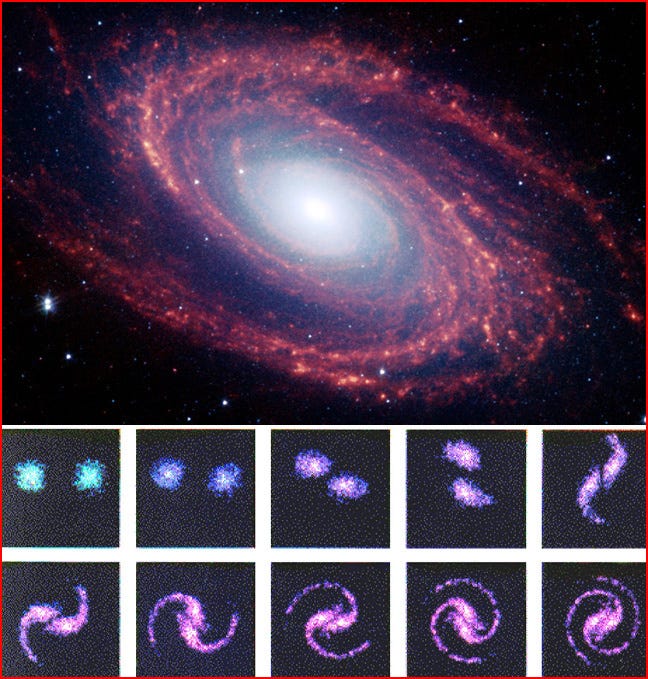 Pratt took these observations to a new level of cosmology when he began to apply the results of two spherical plasmas “pinched” by two magnetic Birkeland filaments of 10 (to the 18) amperes. In his 1986 paper “Evolution of the Plasma Universe II: The Formation of Systems of Galaxies“, Peratt published several simulations which are featured under the M81 spiral galaxy image below.