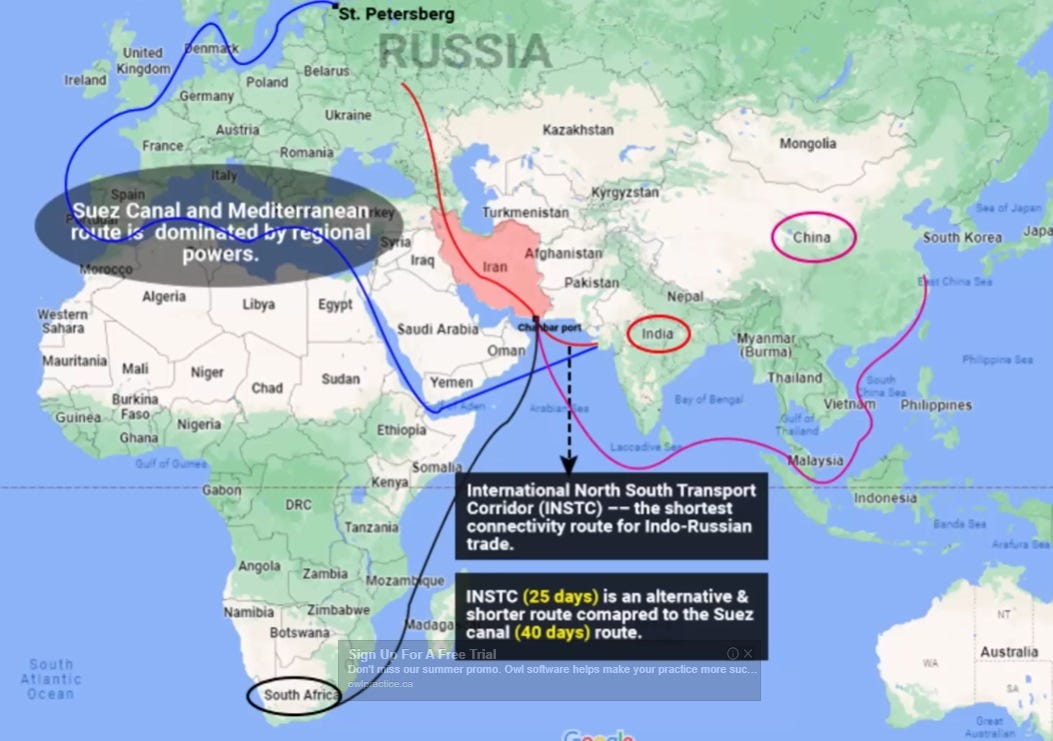 When fully completed, the INSTC will not only circumvent the NATO-controlled zone of the mediteranean zone via the overly congested Suez canal but will cut approximately 10 days and 40% of the transportation costs off the current Suez route.