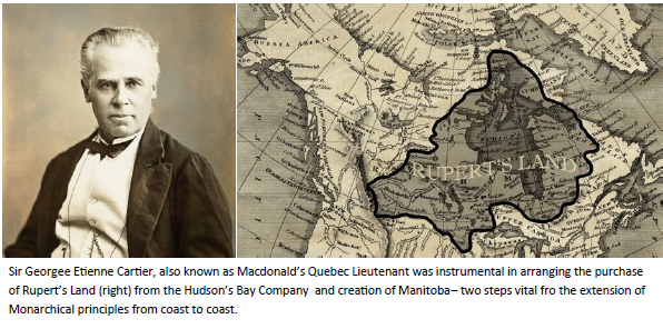 Cartier fought heavily for a trans continental railway and served as the lead negotiator in London organizing the emergency purchase of the vast territories known as “Rupert’s Land” from the Hudson’s Bay Company” for 300, 000 pounds in April 1869. Without this purchase, the extension of Canada’s rail to the Pacific and absorption of the isolated colony of British Columbia were impossible. Following up on the Hudson Bay purchase, Cartier also took the lead to transform the rebellion-ridden Red River Colony into the Province of Manitoba in 1870.