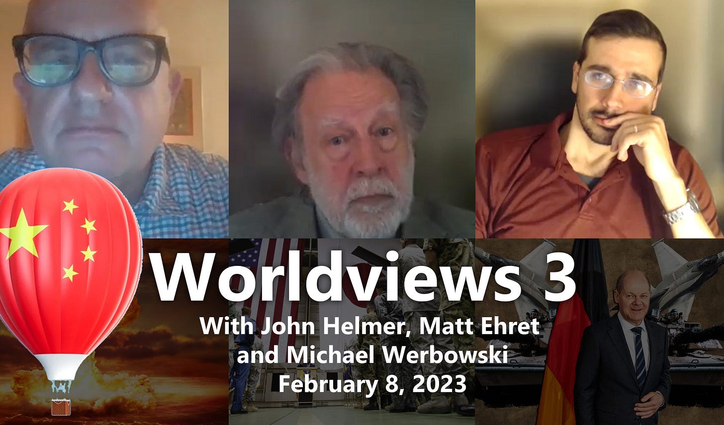 In this episode of Worldviews, host Michael Werbowski talks with John Helmer and I about the strategic world situation with a deep dive into the absurd dynamics surrounding the Chinese spy balloon fiasco, the military build up around China, the west's Indo-Pacific Strategy, the politics of earthquake forecasting and breaking developments in Russia, Ukraine and Germany